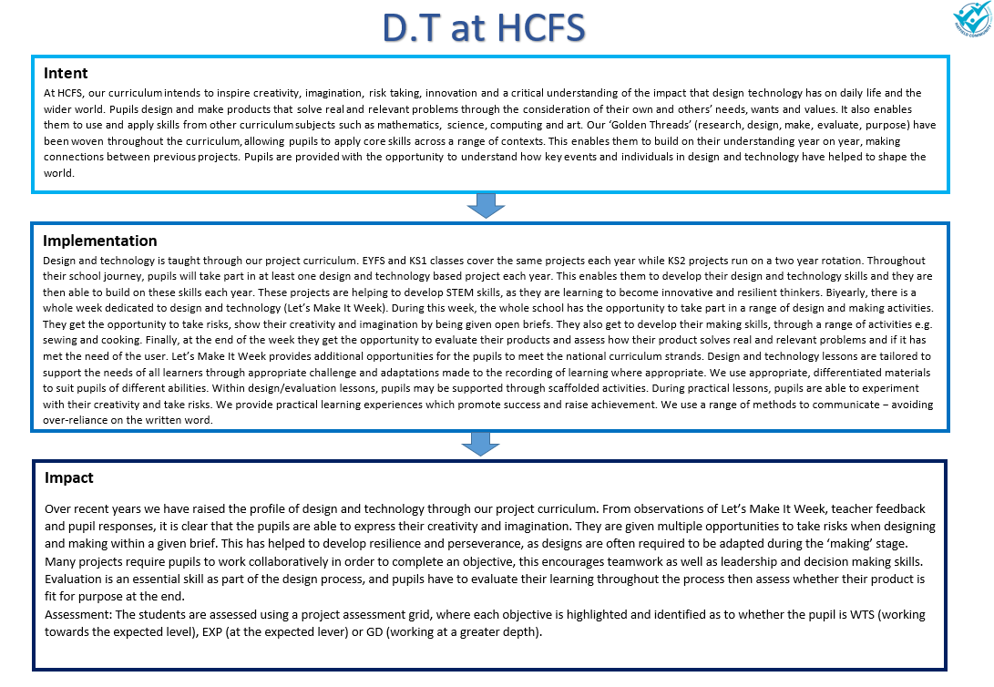 At HCFS, our curriculum intends to inspire creativity, imagination, risk taking, innovation and a critical understanding of the impact of design technology on daily life and the wider world. Children design and make products that solve real and relevant problems considering their own and others’ needs, wants and values whilst enabling them to use and apply skills from other curriculum subjects including mathematics, science, computing and art. Our ‘Golden Threads’ have been woven into the curriculum, allowing them apply the core skills across a range of contexts. This enables them to build on their understanding year on year, making connections between previous projects. Children are provided with the opportunity to understand how key events and individuals in design and technology have helped to shape the world.