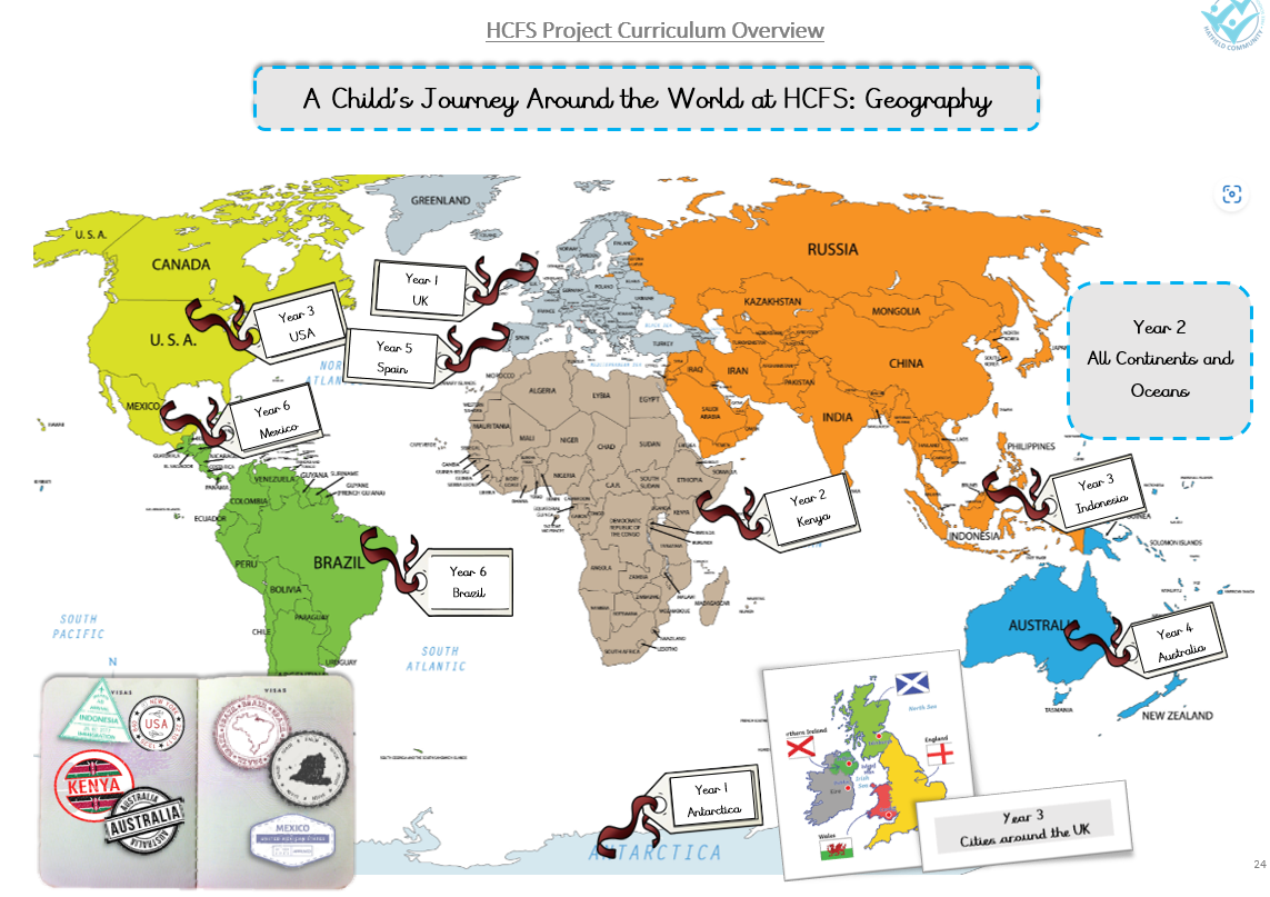 At HCFS, geography helps children build a broader understanding of the world and their place within it. Through carefully planned projects, pupils explore a range of locations taking a journey around the world —from their local area to countries such as the USA, Australia, Brazil, and Kenya—developing locational knowledge and place awareness. As they learn about climates, landscapes, and how people live in different parts of the world, children begin to appreciate global diversity and the connections between human and physical geography. Mapping skills, fieldwork, and enquiry-based learning are introduced early and revisited throughout the curriculum. These experiences help pupils build cultural capital by expanding their knowledge of different communities, traditions, and environments. Geography at HCFS encourages children to think about how people interact with the planet, fostering curiosity, empathy and a growing awareness of environmental responsibility.