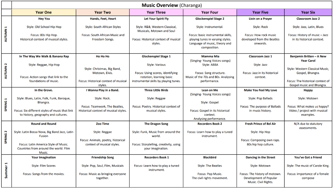 Each unit of work is designed to be taught over 6 sessions with all of the learning focusing around one song. Each unit comprises the following strands of musical learning which correspond with the national curriculum for music: