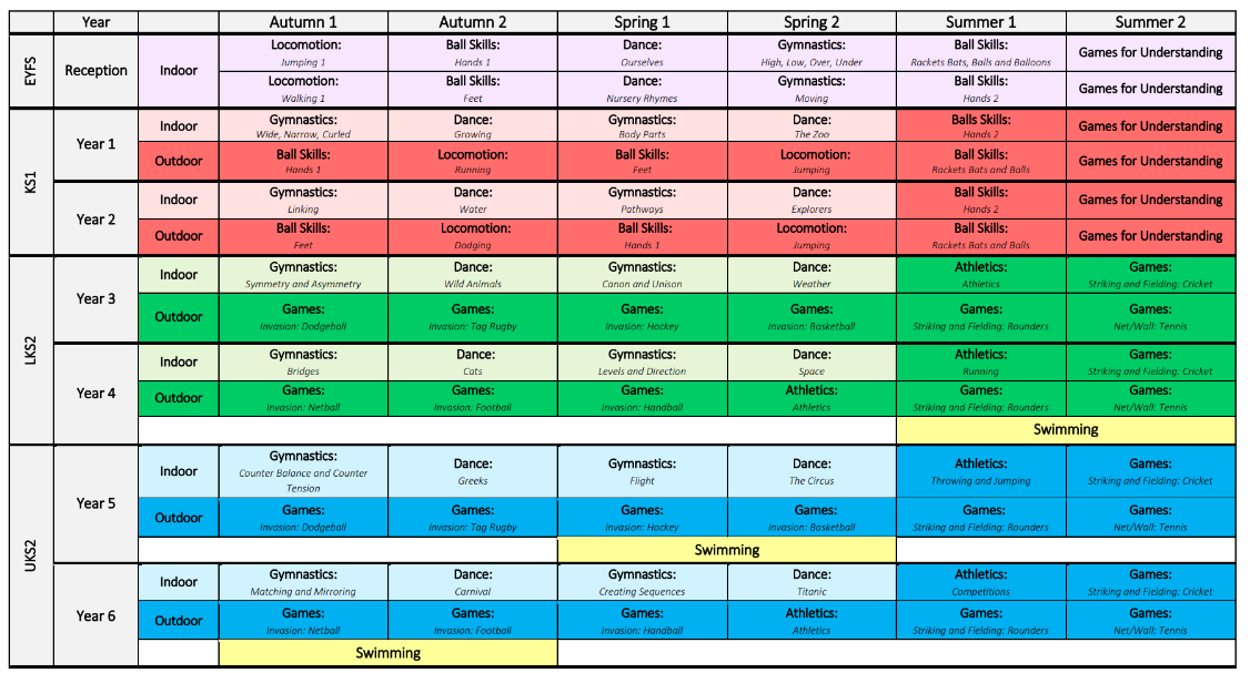 Through extensive opportunities to participate in sport and collaborative games, pupils build character and deepen their understanding of core values such as fairness, respect and teamwork. As pupils progress through the school, they develop a secure foundation of essential physical skills which are progressively built upon year by year through a broad range of sports and movement‑based topics.