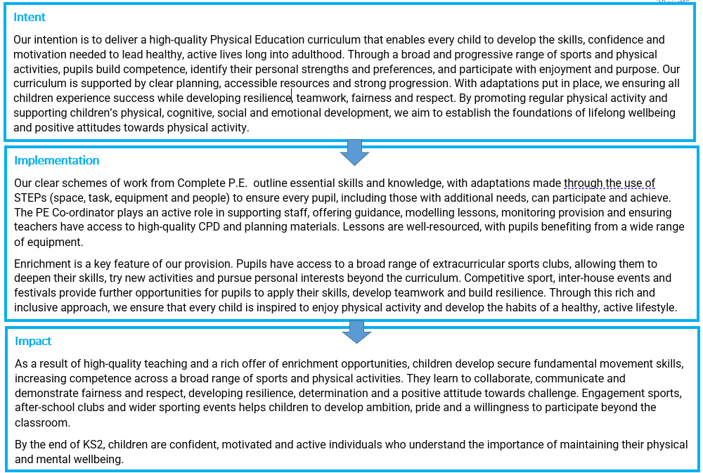 At Hatfield Community Free School, Complete P.E. is a scheme used to ensure a broad and balanced curriculum. The curriculum is designed to motivate and empower children to succeed across a wide range of physical activities, including competitive sport. We aim to develop physically confident learners whose skills, knowledge and attitudes support lifelong health and fitness. By engaging with a rich variety of sports, pupils are able to explore different disciplines, recognise their personal strengths and preferences, and discover activities they enjoy and may wish to pursue further.